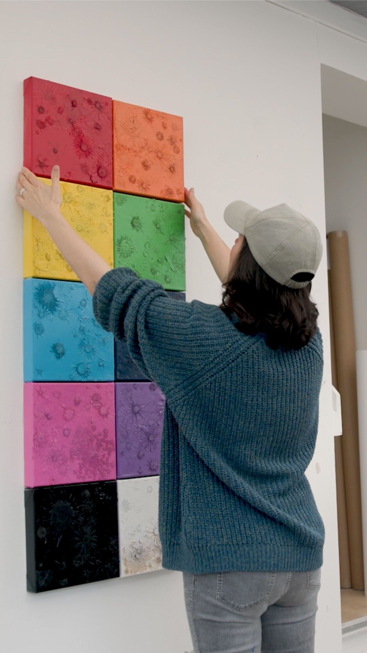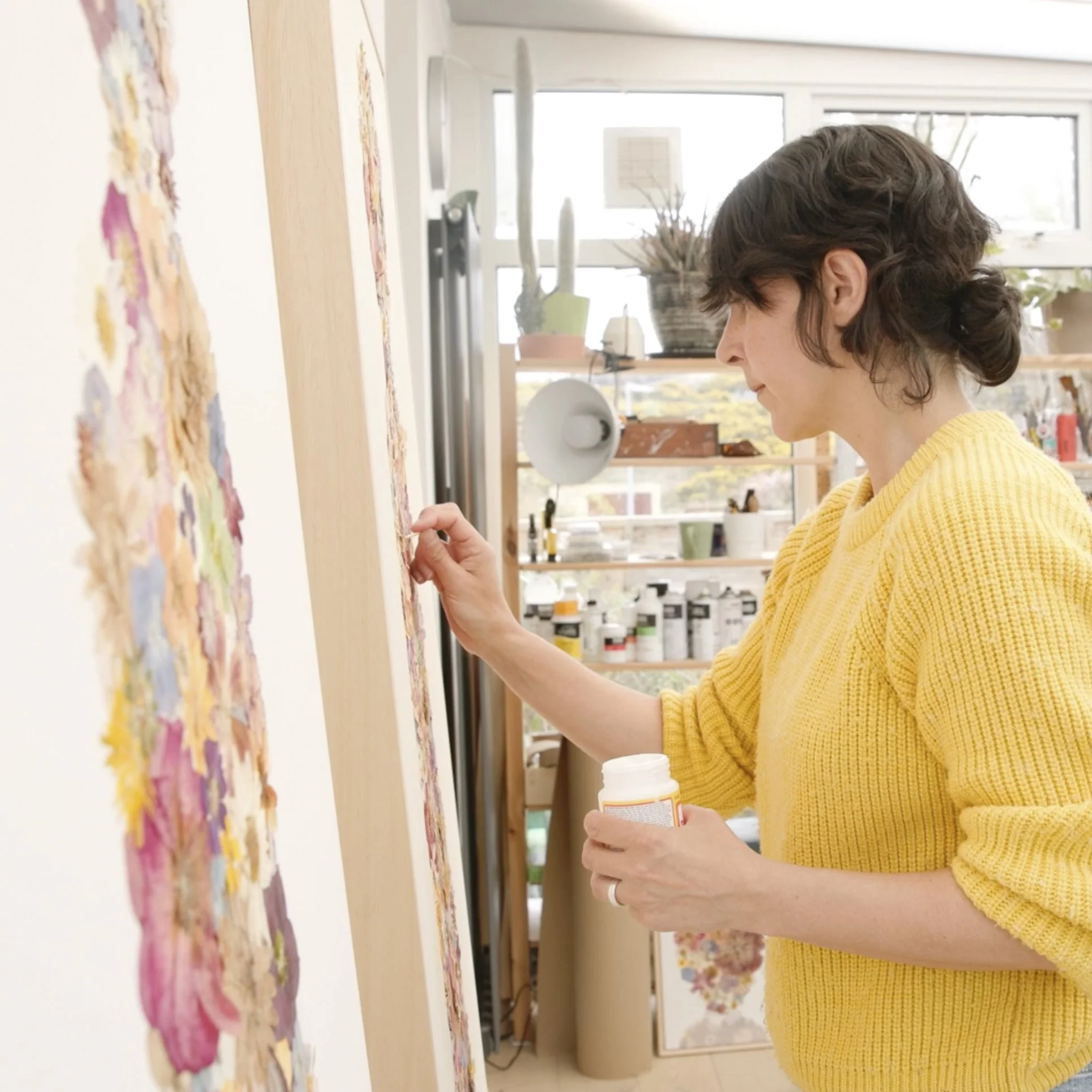 Her practice combines traditional flower pressing with modular formats and shapes, forcing organic matter into systems of repetition and order.
