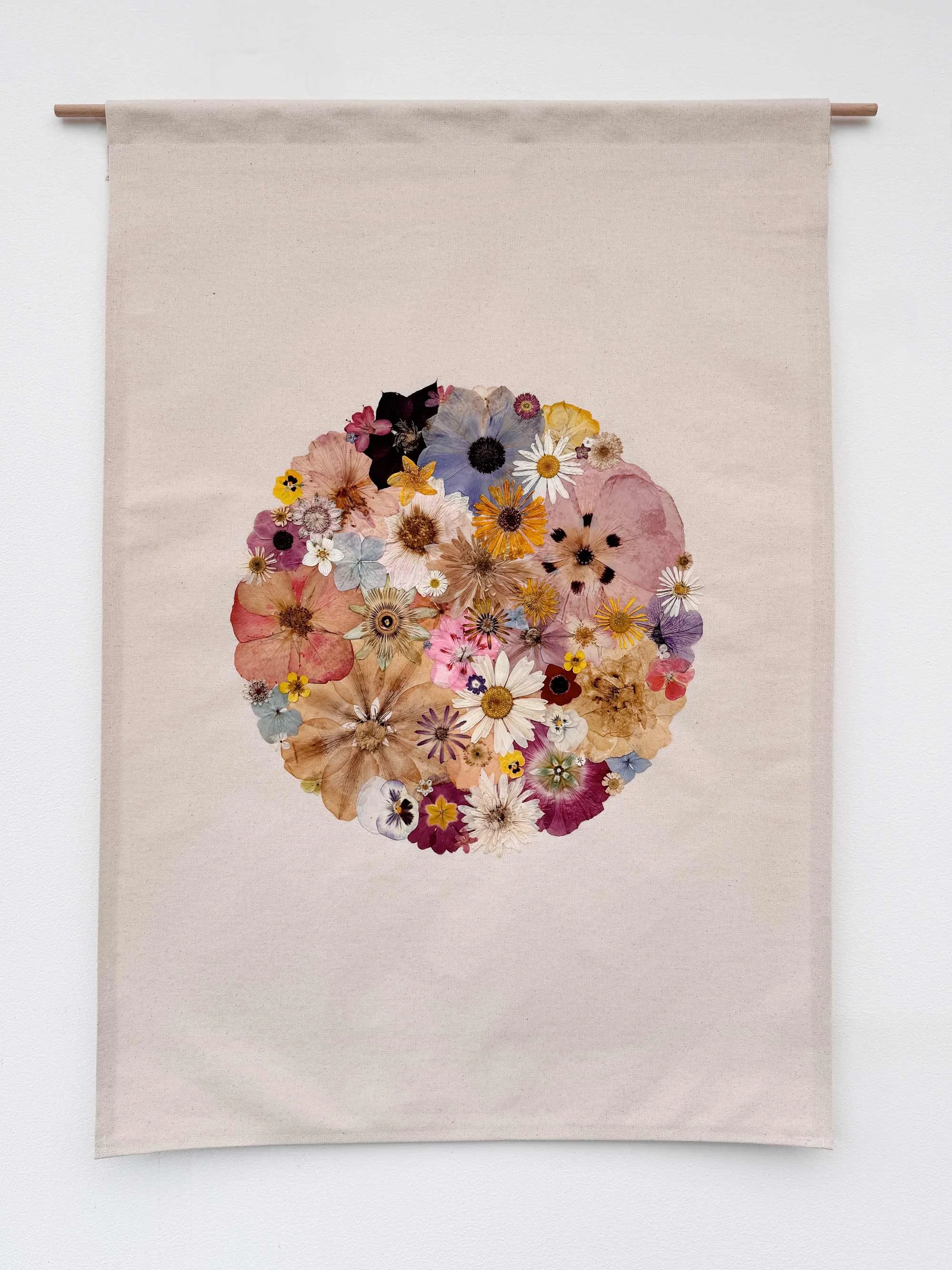 Pressed flowers on canvas with wooden (beech) hanging rod