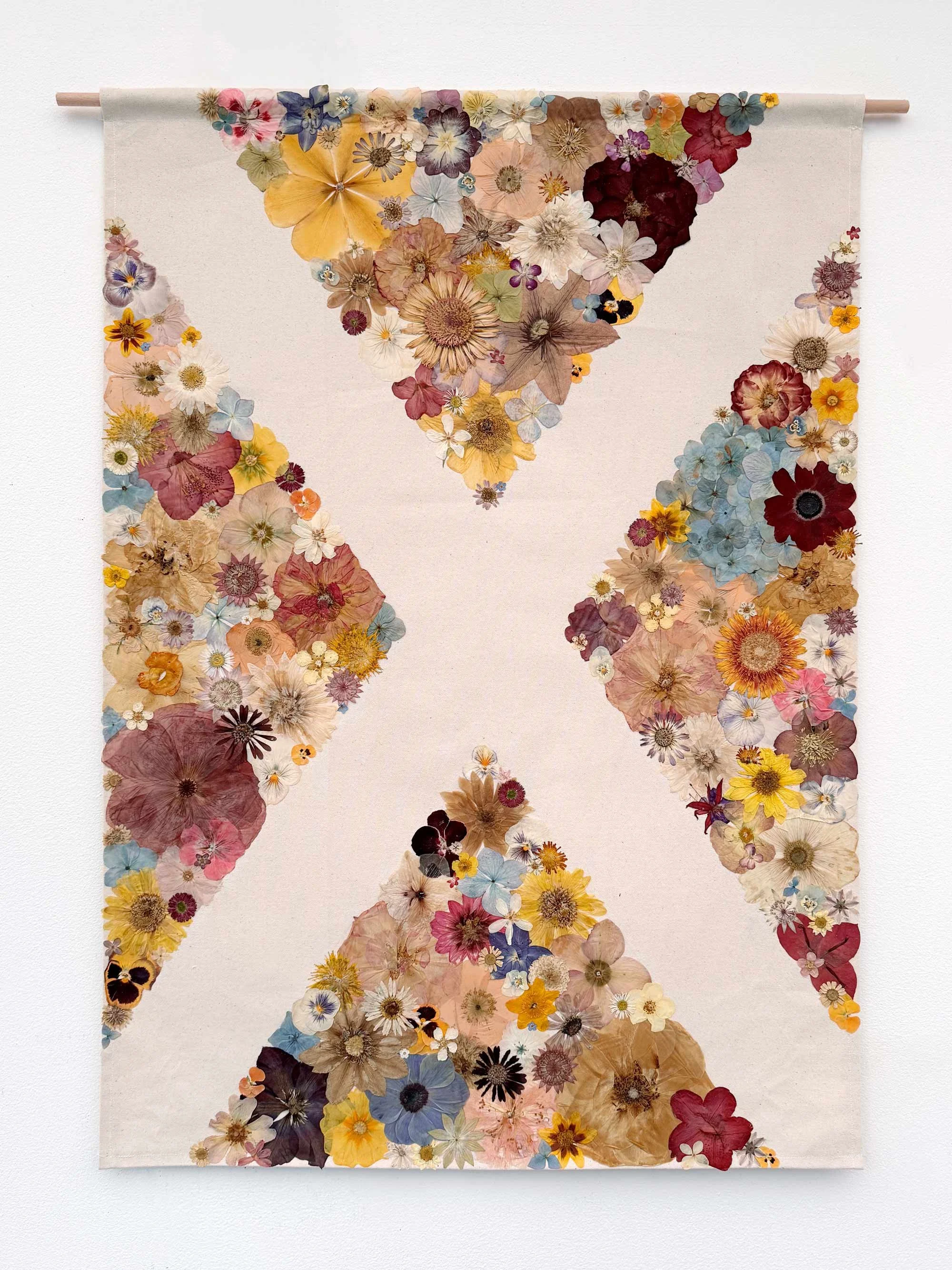 Pressed flowers on canvas with wooden (beech) hanging rod