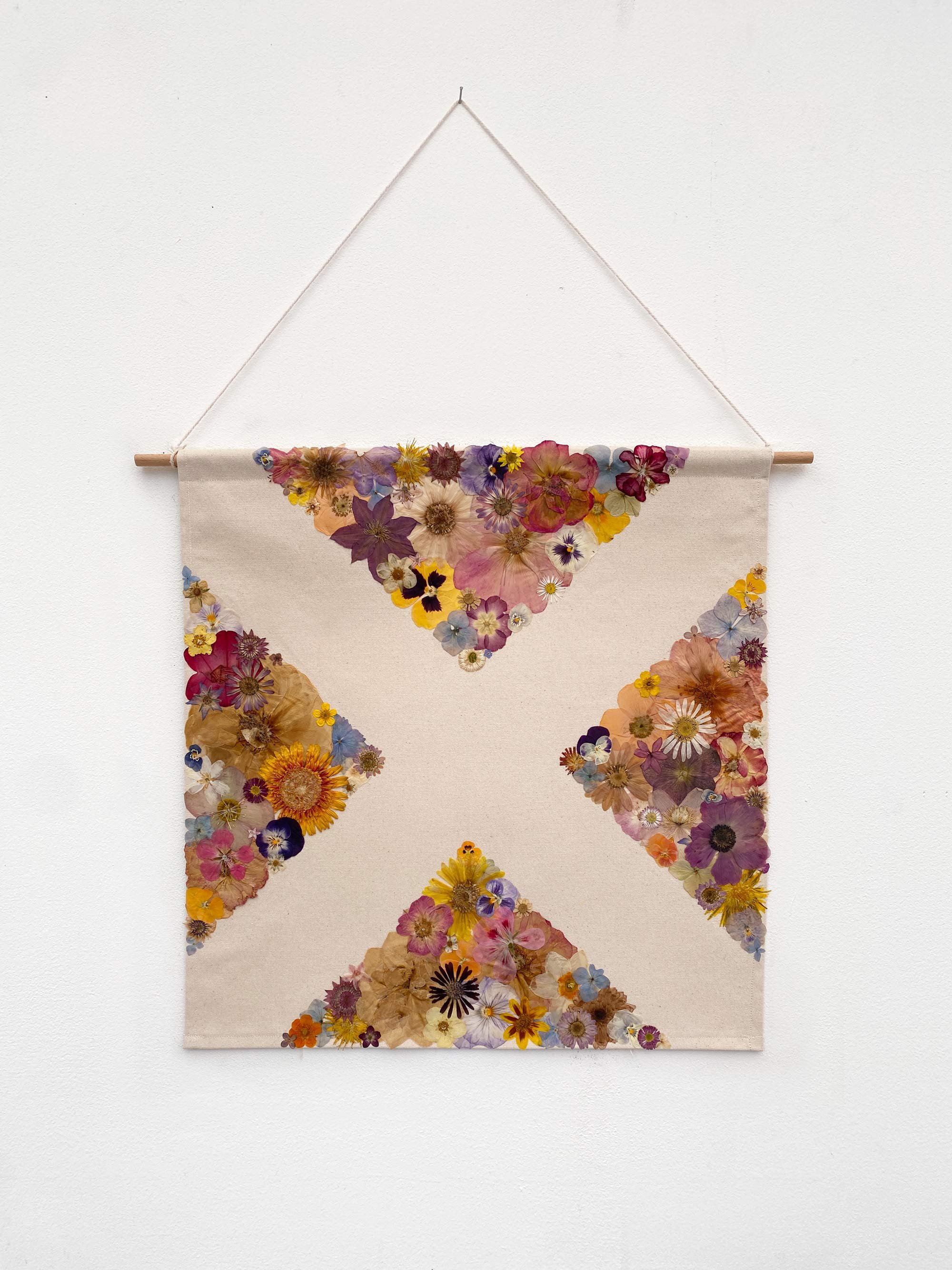Pressed flowers on canvas with wooden (beech) hanging rod