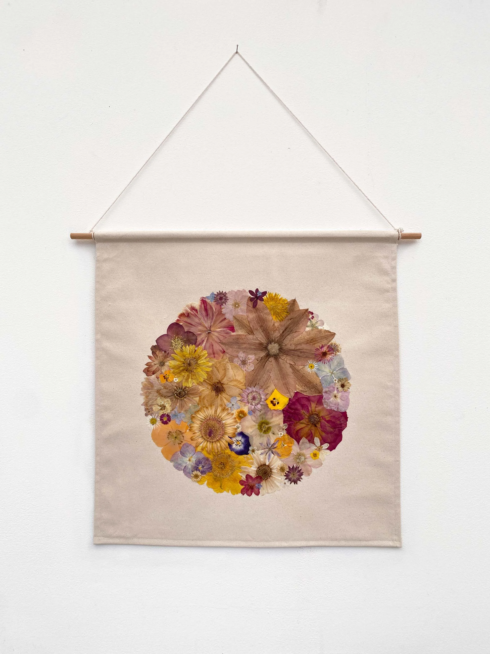 Pressed flowers on canvas with wooden (beech) hanging rod